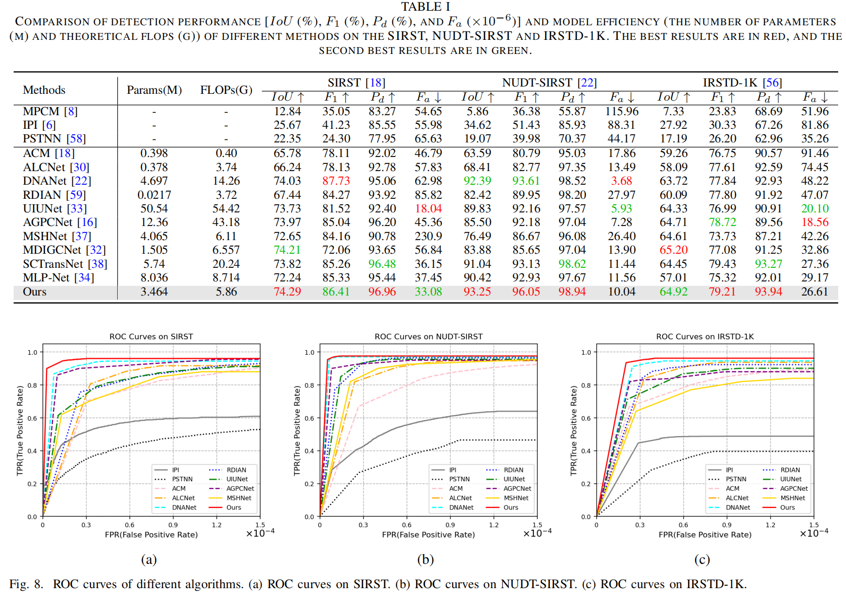 实验验证中,将ARFHANet网络与多种SOTA方法进行了数值和可视化结果的对比,绘制了ROC曲线,如图2所示,提出的算法在检测和背景抑制性能方面表现优异。