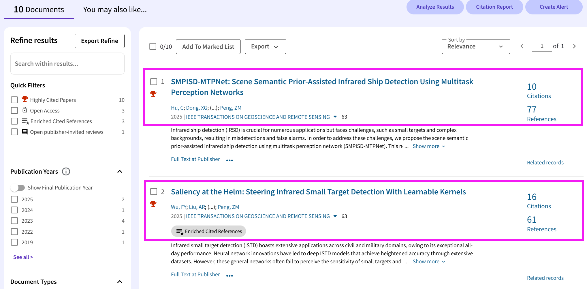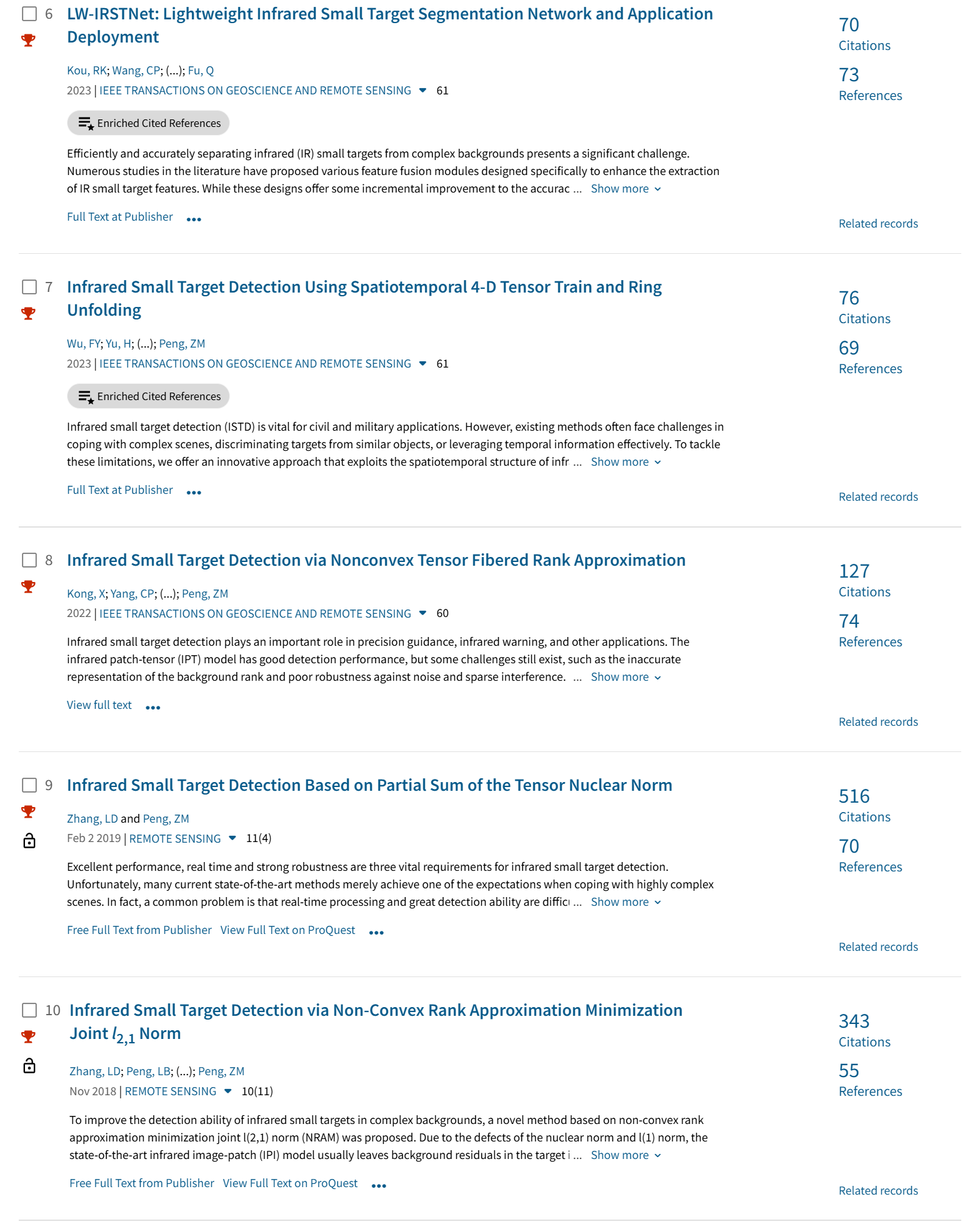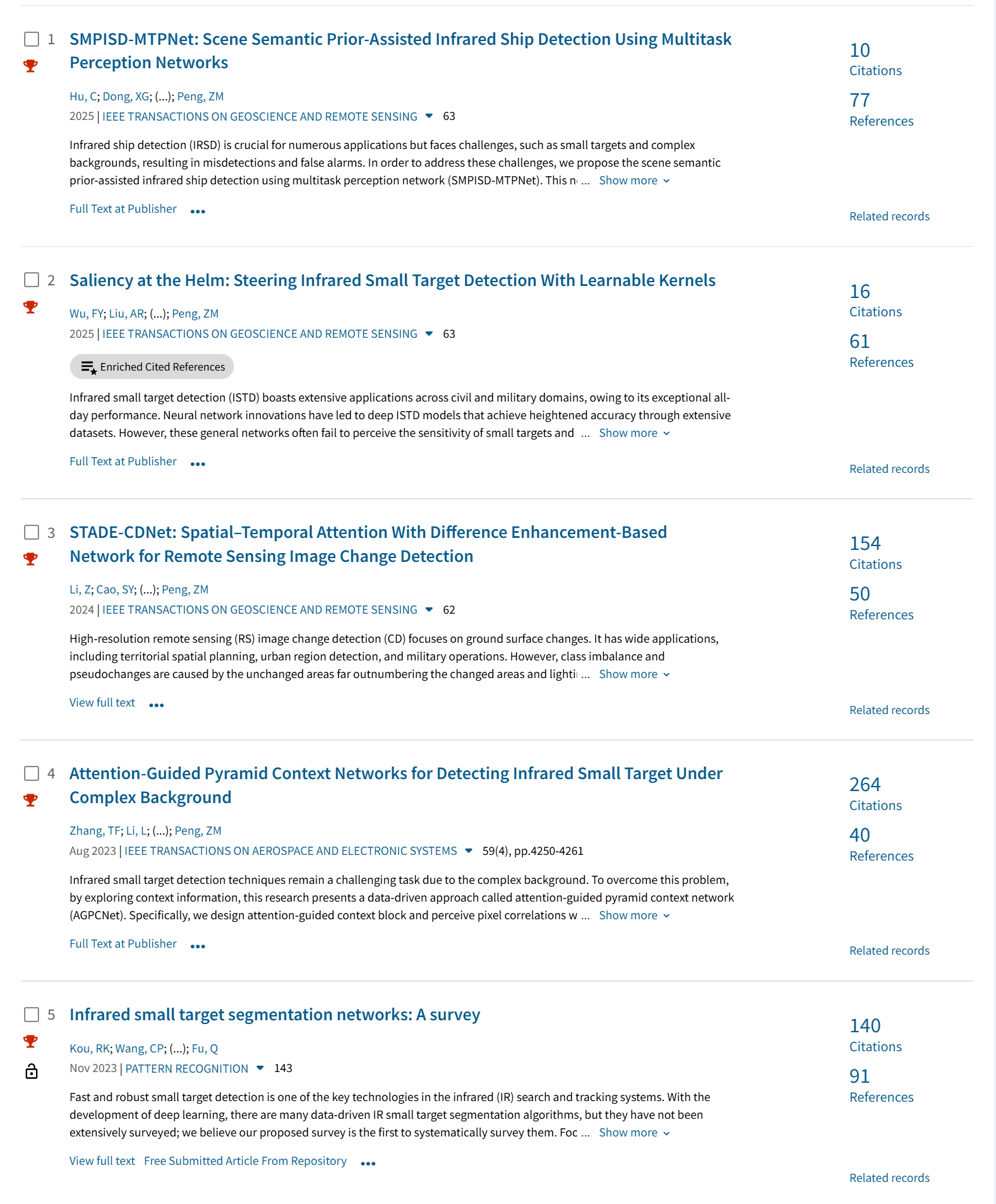 研究成果主要涉及红外成像探测领域的舰船检测和红外小目标检测方向。
